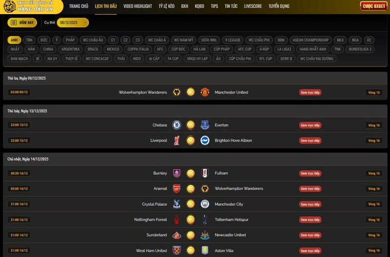 Lịch bóng đá cập nhật theo ngày – theo tuần – theo giải